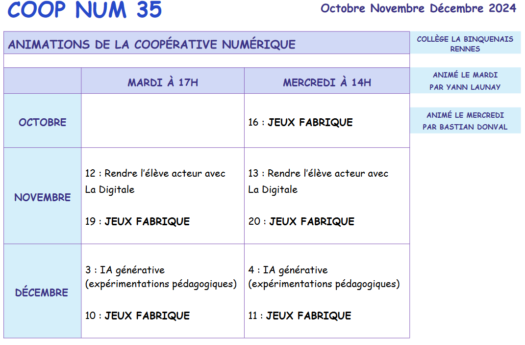Pour ce premier trimestre de l’année scolaire 2024-2025, vous pouvez nous rejoindre à la coopérative du 35 (collège de la Binquenais, Rennes) dès le 16 octobre pour diverses animations !